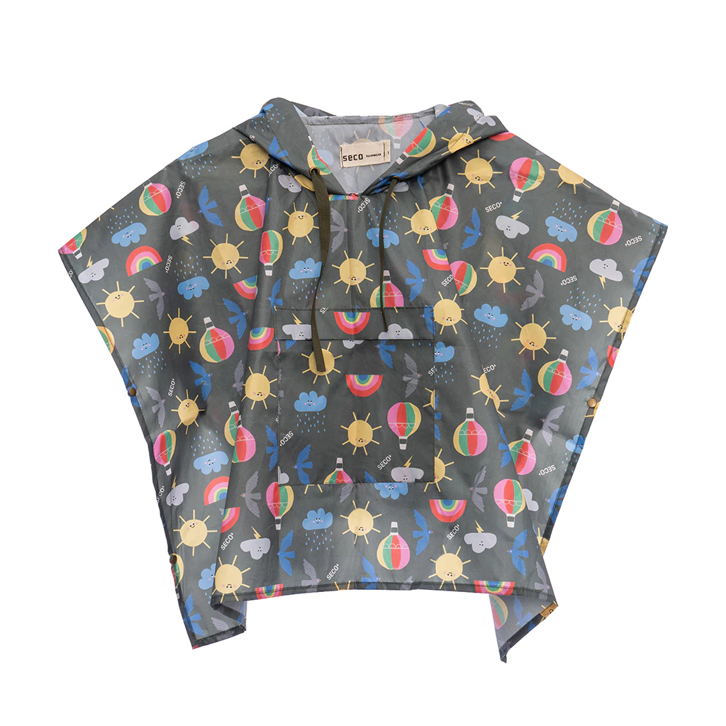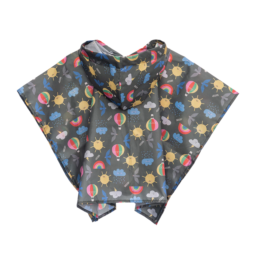 Capa de lluvia para niños tipo poncho con capucha y bolsillo.