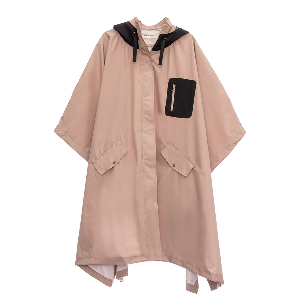 Parka o poncho para la lluvia, color beige con capucha y cierre en el delantero.